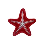 Broche en forma de estrella de mar, elaborado en cuero bovino y pintado a mano. Cada detalle captura la esencia de este animal, aportando un acento artesanal y vibrante. Disponible en rojo y naranja.
